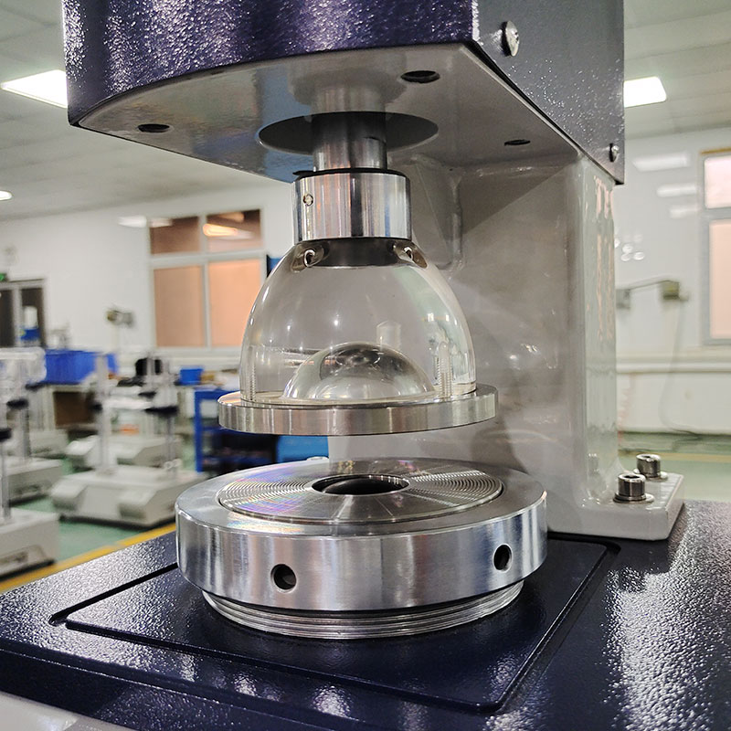 在儀器密封的油缸和壓紙座的容腔內(nèi),裝滿甲基硅油作為壓力傳遞的介質(zhì),當電機帶動活塞勻速前進時,橡皮膜受到硅油的加壓而突起,此時夾持在膠膜上方,被上下夾盤固定住的試樣,均勻受力,直到試樣破裂,處理芯片鎖住最大壓力值,通過液晶屏顯示該壓力值,此壓力值即為本次試樣的耐破度。
